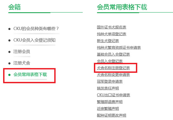 然后点击会员常用表格下载 ,选择犬舍名称注册登记然后点击会员常用表格下载